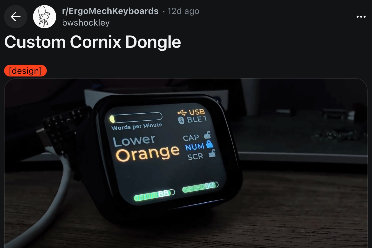 screenshot of https://www.reddit.com/r/ErgoMechKeyboards/comments/1ofuiqf/custom_cornix_dongle/ posted by bwshockley